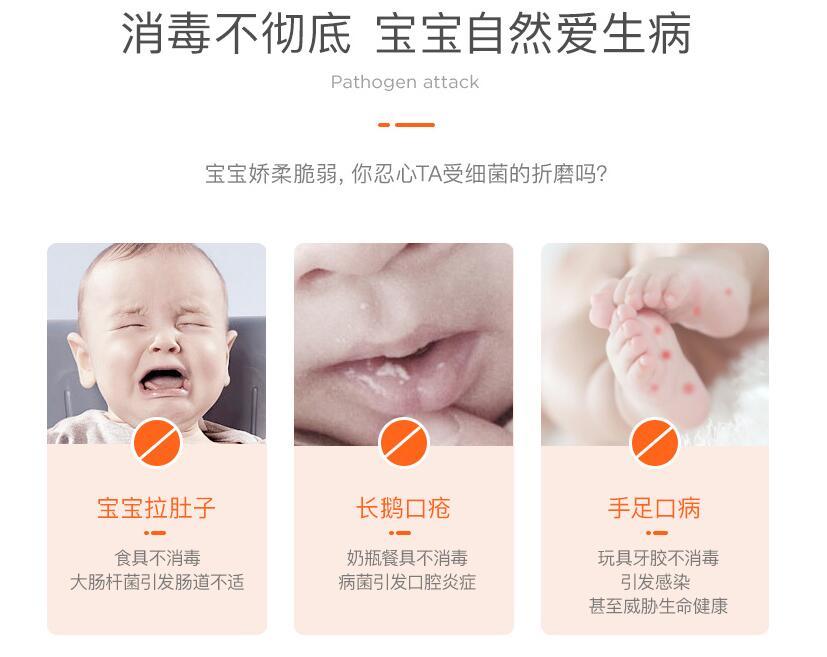 夏季高溫的確能殺死不少不耐高溫的細菌、病毒,但部分耐高溫的細菌、病毒是太陽光殺不死的。此外,夏季室內因開空調導致屋內通風度不夠,且空調形成的陰涼環境是比較容易引起細菌滋生的。特別是寶寶使用的奶瓶、玩具、餐具等物品,若是清潔消毒工作不到位的話,及其容易滋生細菌,病菌通過寶寶嘴巴、手、皮膚等接觸,進入寶寶體內,破壞寶寶身體抵抗力,寶寶身體就會發生相應疾病癥狀,比如咳嗽、腹瀉、發燒、嘔吐、起疹子等等各種癥狀,影響寶寶健康。