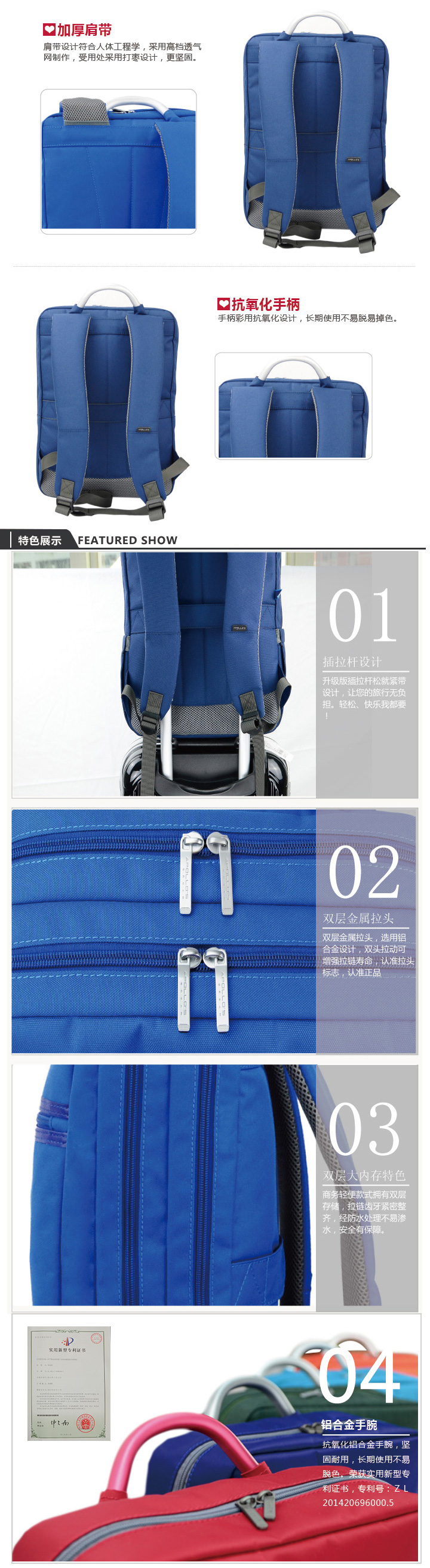 本款商務電腦背包是男女的最愛,他外形色彩成穩,以深色去選擇紅色、藍色,以淺色選擇淺藍色,簡單的色調百搭所有的服飾。在底部的設計中加入PU皮料包裹底部,搭配五金提手與拉頭,讓整體顯得優雅大方。在整體的美觀上,內部的存儲更是不能馬虎設計。前幅設有拉鏈袋,A4大小深度,可存放A4用品;一層主袋設有專業電腦層、IPAD層和自由層,主袋前幅更設有筆槽、煙位槽和錢包槽,將小件用品集中存放,方便拿取。