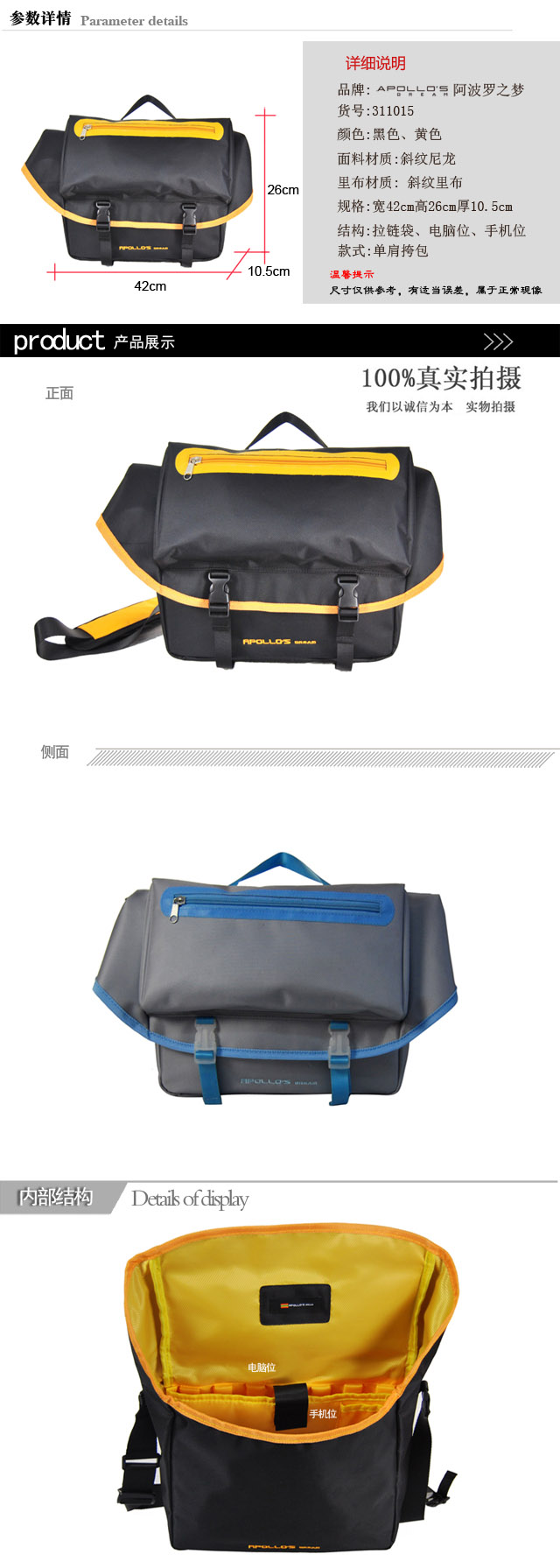 此款休閑挎包主料斜紋料,耐磨性高.蓋頭設計有多功能袋,可放置手機,筆,筆記本等物品拿取方便.電腦袋獨特設計了條形柱.走路時包內物品不會直接碰撞.有防震作用.裝10”手寫平板電腦.